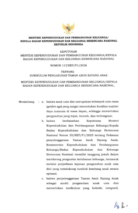 Keputusan Menteri Kependudukan dan Pembangunan Keluarga Nomor 127/KEP/F1/2026 Tentang Kurikulum Pengasuhan Taman Asuh Sayang Anak Menteri Kependudukan dan Pembangunan Keluarga/Kepala Badan Kependudukan dan Keluarga Berencana Nasional